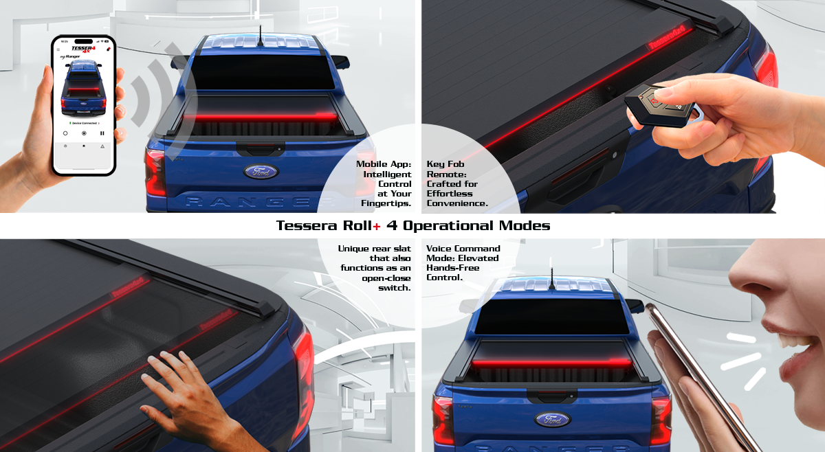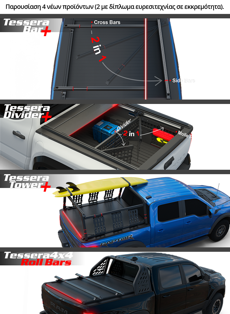 Αναβαθμίστε το φορτηγό σας με το Tessera Roll+, το κορυφαίo αναδιπλούμενο ρολό καπάκι αλουμινίου. Προσφέροντας ειδικό σχεδιασμό προϊόντος 3 σε 1 (χειροκίνητο, χειροκίνητο με ελατήριο, ηλεκτρικό) για απαράμιλλη ευελιξία, και το πρώτο ρολό καπάκι παγκοσμίως με κύκλωμα ελέγχου Τεχνητής Νοημοσύνης. Με το Tessera Roll+ ενισχύεται η λειτουργικότητα, η ασφάλεια και το στυλ του φορτηγού σας. Ανακαλύψτε το Tessera Roll+ που αλλάζει τα δεδομένα στη βιομηχανία των 4x4 αξεσουάρ και μεταμορφώστε την οδηγική σας εμπειρία.